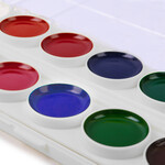Акварель выпускается в двухъярусном пластиковом пенале с прозрачной крышкой. Двухъярусная форма пенала делает его компактным по размеру, благодаря чему можно сэкономить место в рюкзаке. Удобный замок легко открывается и закрывается. Пенал достаточно прочный, выдерживает многократные падения. Крышку можно использовать как палитру для смешивания красок, есть отделение для кисточки .